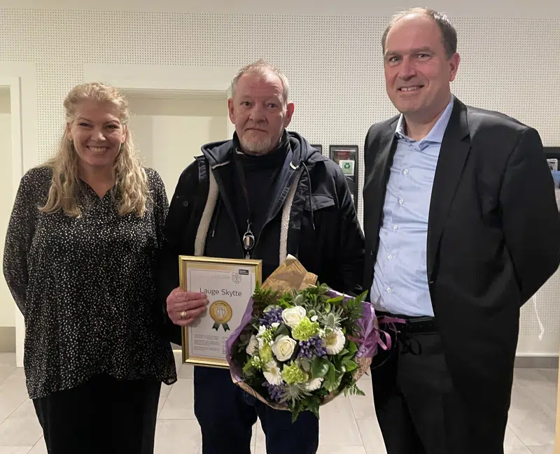 Foto: Vinder af 'Årets kollega' Lauge Skytte sammen med borgmester Birgitte Neergaard-Kofod og kommunaldirektør Jonatan Schloss.