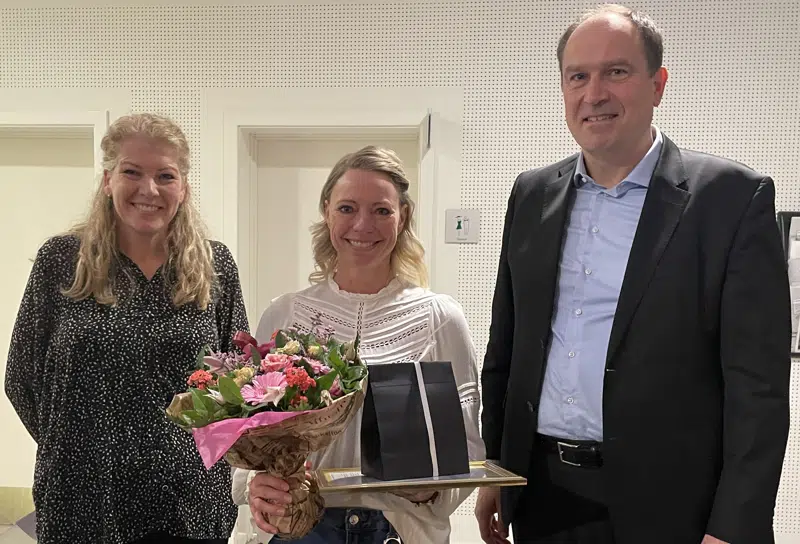 Foto: Vinder af 'Årets kollega' Nina Hildestad sammen med borgmester Birgitte Neergaard-Kofod og kommunaldirektør Jonatan Schloss.