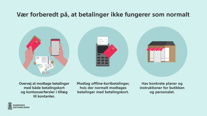Nationalbanken anbefaler nu, at alle erhvervsdrivende i den fysiske handel forbereder sig på situationer, hvor betalinger ikke kan foretages som normalt – så både kunder og ansatte undgår unødige frustrationer.