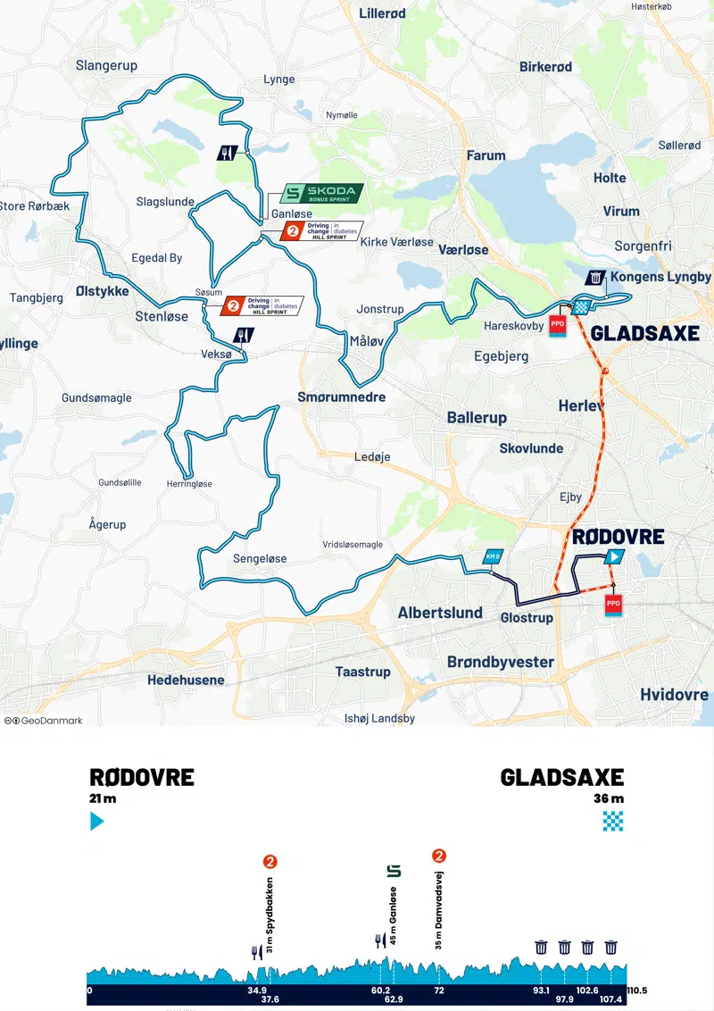 Efter starten - omkring kl. 15 - på rådhuspladsen i Rødovre kører rytterne nord for København og bl.a. gennem Sengeløse (10 km), Hove (25 km), Stenløse (40 km) og Ølstykke, hvor dagens bonusspurt er henlagt efter 45 km på Rådhus Allé. Efter 57 km rammer feltet den smalle vej Krogenlund, som bringer feltet forbi Mølleåens Golf Klub. Nu begynder den mere kuperede del af etapen, for efter 64 km kommer rytterne første gang til Ganløse. Ved Slagslunde (67 km) er det tid for rytterne at kæmpe om dagens første bakkepoint. Anden gang ”bjergbenene” skal findes frem, er blot 5 km senere, når feltet for anden gang kører ind i Ganløse. Fra Ganløse går det via Måløv og Værløse ind til den publikumsvenlige rundstrækning i Gladsaxe, hvor etapevinderen skal findes. Etapen forventes at være afsluttet omkring kl. 17.40.